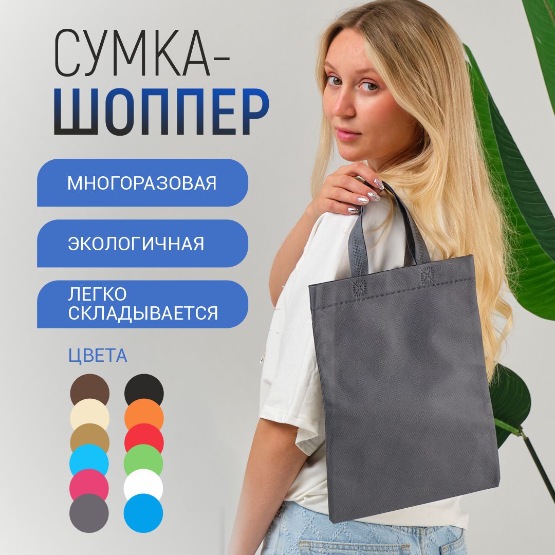 Сумка-шоппер из спанбонда с пришивными ручками 15 см, серая, 26 х 33 см