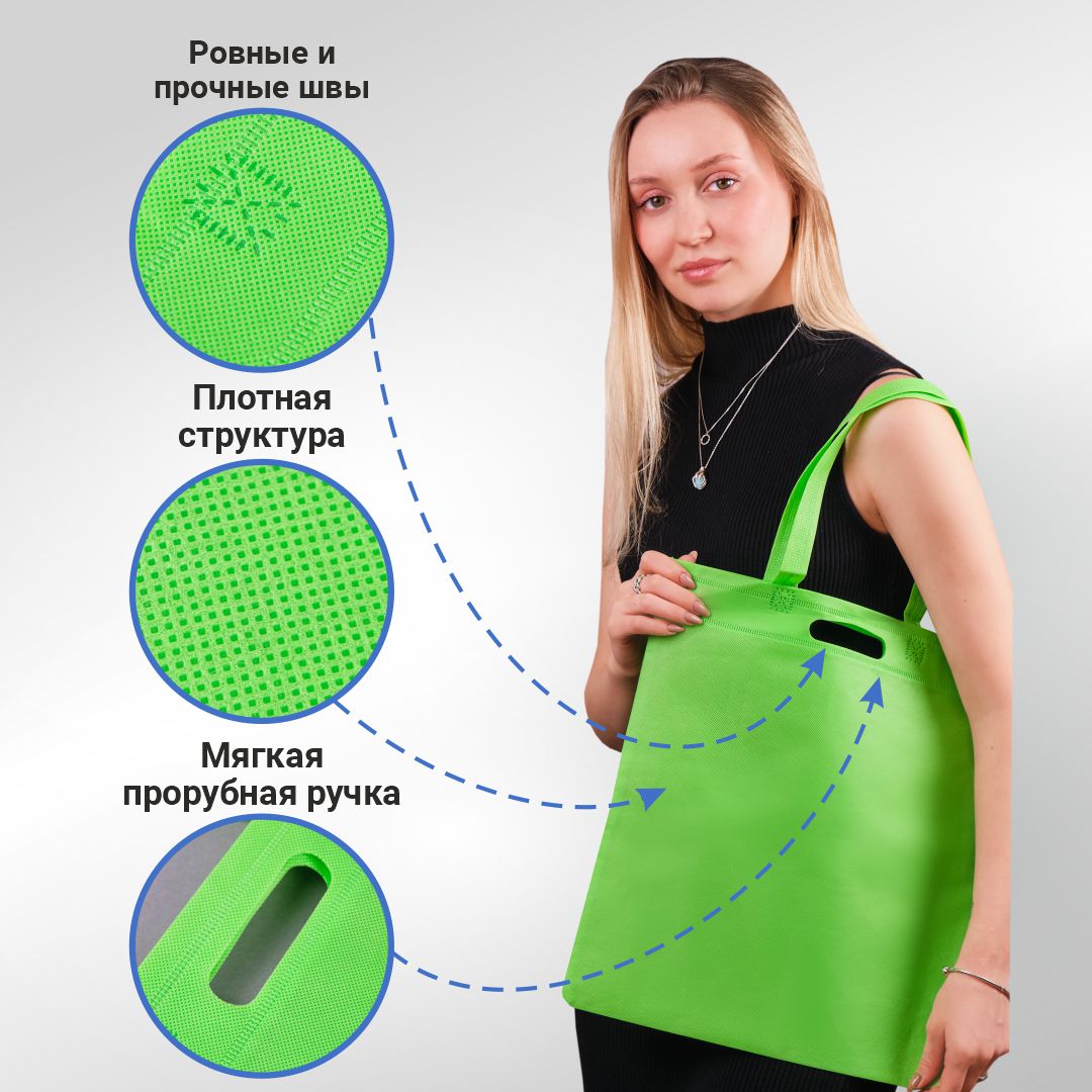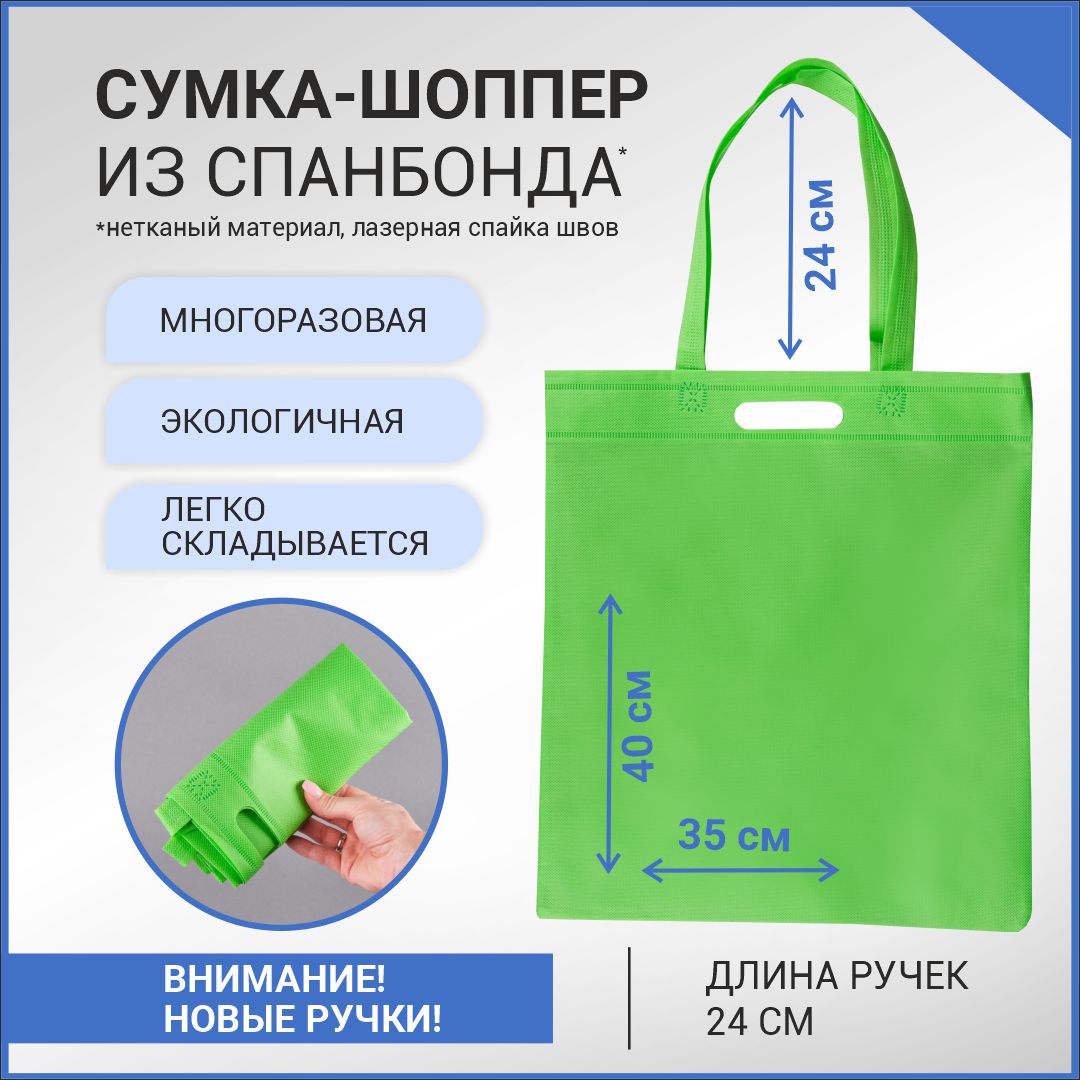 Многоразовый шоппер из нетканого материала с надежными пришивными ручками. Сумка из спанбонда приятная на ощупь, легкая и компактная.