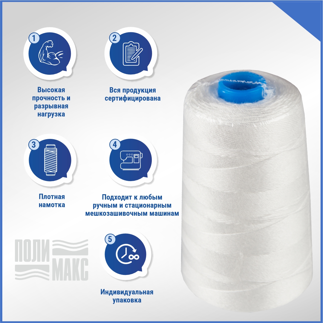 В компании «Полимакс» представлены белые мешкозашивочные нити из 100% полиэстера. Ими фиксируют горловины мешков для защиты содержимого от влаги, мусора, просыпания во время транспортировки.