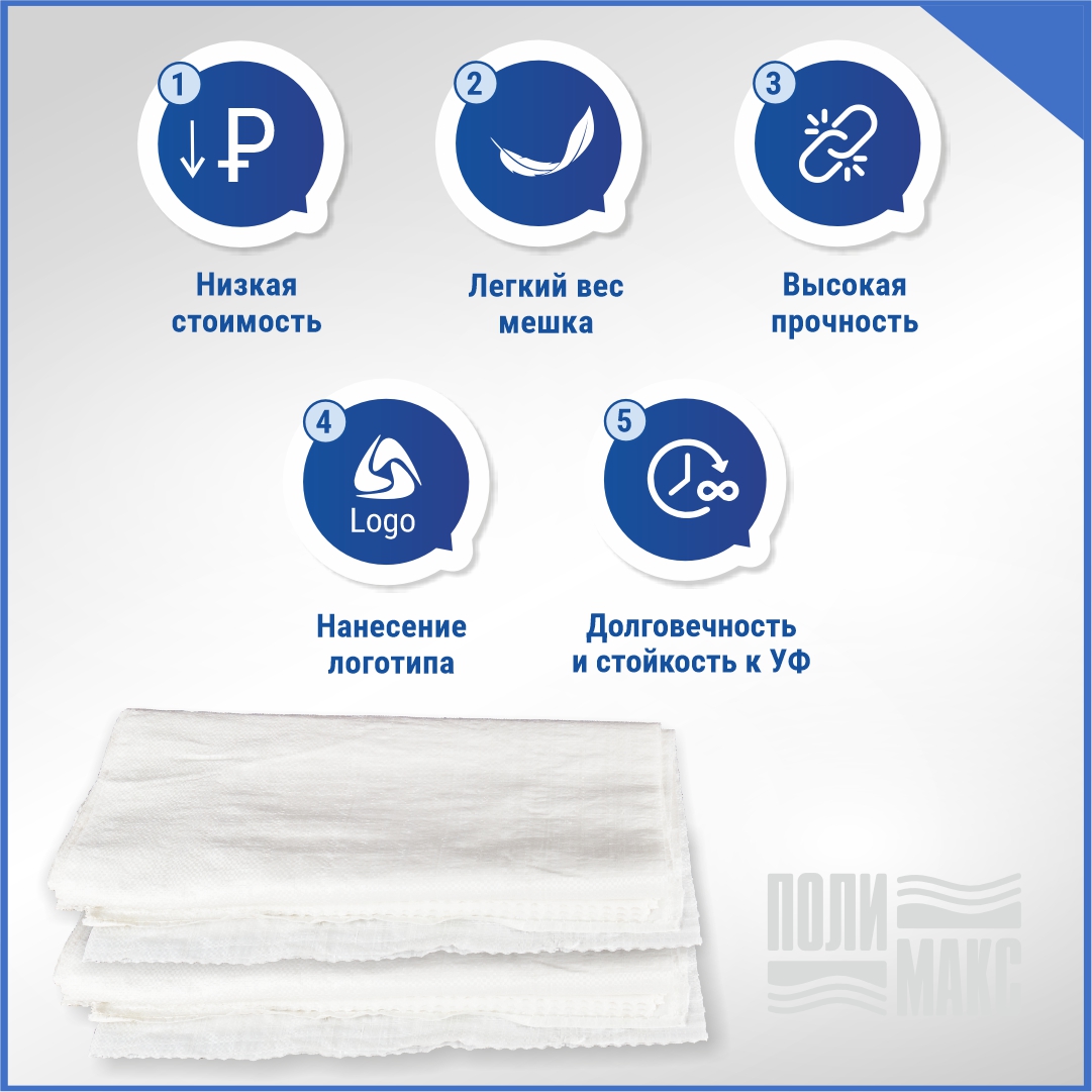 Компания «Полимакс» предлагает белые мешки из первичного полипропилена размером 55×105 см и вместимостью до 50 кг. Плотное плетение обеспечит сохранность содержимого. Ткань воздухопроницаема, поэтому пищевая продукция сохраняет свое качество. Посторонний запах отсутствует.