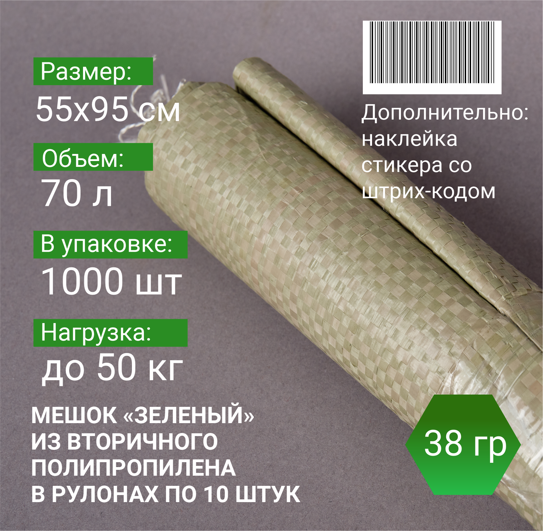 —Мешок п/п зеленый 50 кг, 55x95, 38г, рулоны по 10 шт.